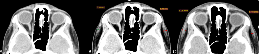 С – через 3 недели, толщина имплантата слева 5,3 мм, справа 5,4 мм