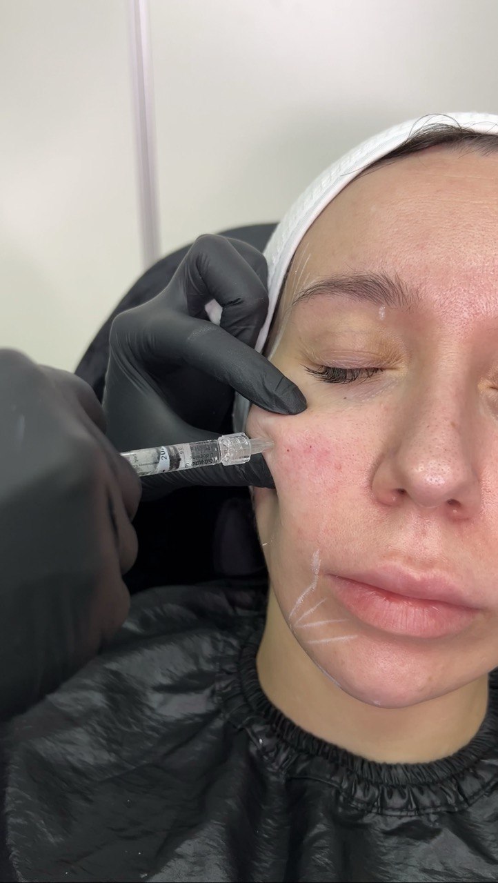 Скуловая + подглазничная области: 0,8 мл с каждой стороны (игла 27G*13 mm).