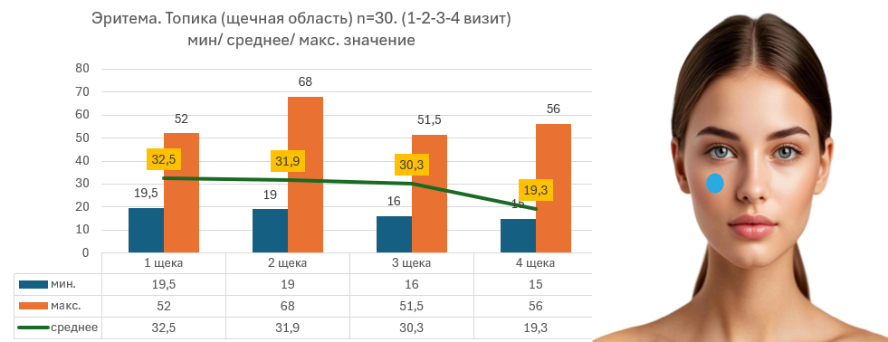 Область щеки: средние показатели 1 визит/4 визит составляют 32,5ЕД/19,3ЕД, что составляет прирост -41% (снижение эритемы).
