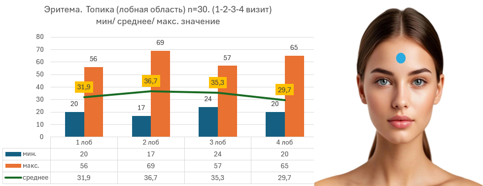 Область лба: средние показатели 1 визит/4 визит составляют 31,9ЕД/29,7ЕД, что составляет прирост -7% (снижение эритемы).