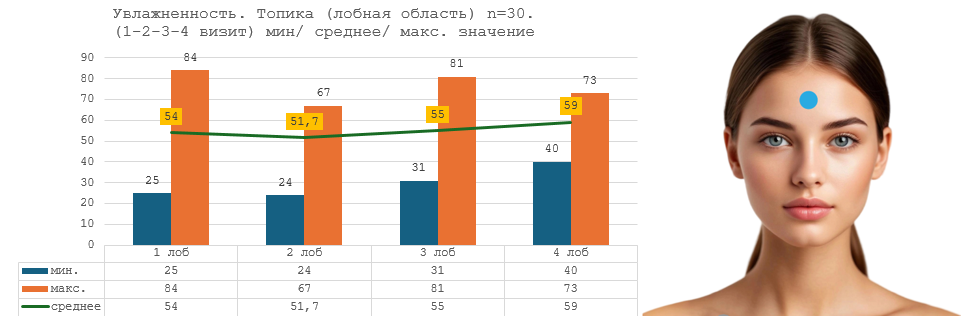 2.Область лба: средние показатели 1 визит/4 визит составляют 54ЕД/59ЕД, прирост +9% (увеличение увлажненности кожи).