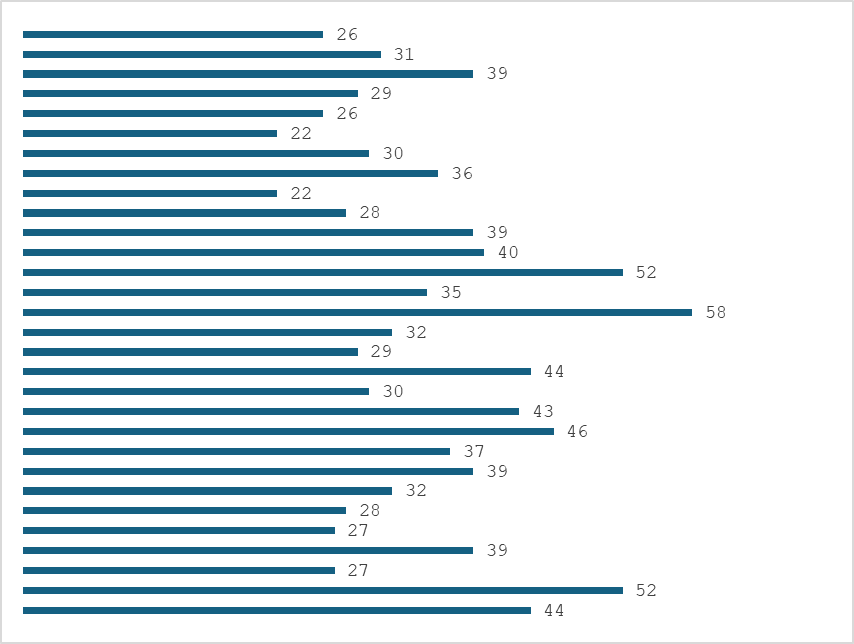 В рамках наблюдательной программы в период с сентября 2024 года по март 2025 года было обследовано 30 женщин-добровольцев в возрасте от 21 до 58 лет (средний возраст — 35,6 года). Индивидуальные значения возраста участниц представлены на диаграмме 1, а их распределение по возрастным категориям — на диаграмме 2. Наибольшее количество участниц приходилось на возрастные группы 27 - 39 лет. Таким образом, в выборке преобладали женщины зрелого репродуктивного возраста.