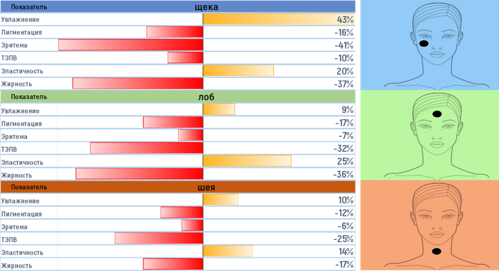 2.Уменьшение пигментации в щечных областях на -16%, в лобной области-17%, на коже шеи 12 %;