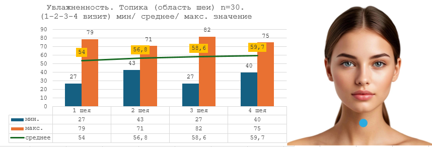 3.Область шеи: средние показатели 1 визит/4 визит составляют 54ЕД/59,7ЕД, прирост +10% (увеличение увлажненности кожи).