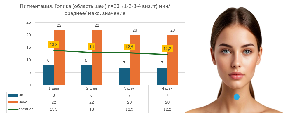 3.Область шеи: средние показатели 1 визит/4 визит составляют 13,9ЕД/12,2ЕД, что составляет прирост -12% (снижение пигментации).