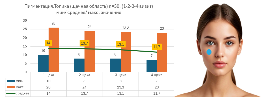 1.Область щеки: средниепоказатели 1 визит/4визит составляют 14ЕД/11,7ЕД, что составляет прирост -16%% (снижение пигментации).