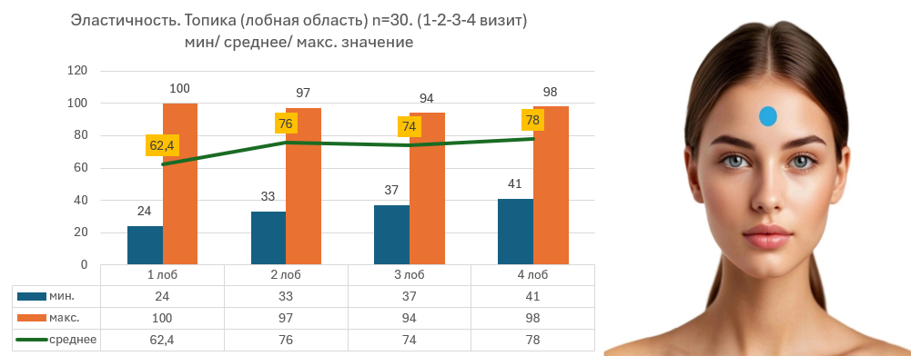 2.Область лба: средние показатели эластичности: 1 визит/4 визит составляют 62,4ЕД/78 ЕД, увеличение на + 25 %
