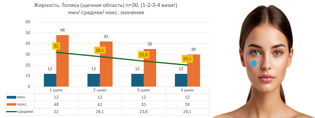 1.Область щеки средние показатели жирности кожи: 1 визит/4 визит составляют 32ЕД/20,1ЕД, что составляет - 37%