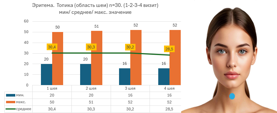 Область шеи: средние показатели 1 визит/4 визит составляют 30,4ЕД/28,5ЕД, что составляет прирост -12% (снижение эритемы).
