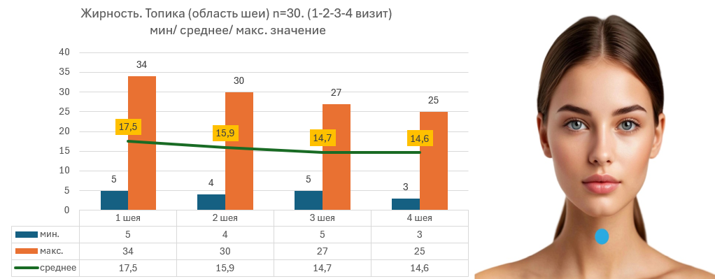 3.Область шеи средние показатели жирности кожи: 1 визит/4 визит составляют 17,5ЕД/14,6 ЕД, что составляет -17%