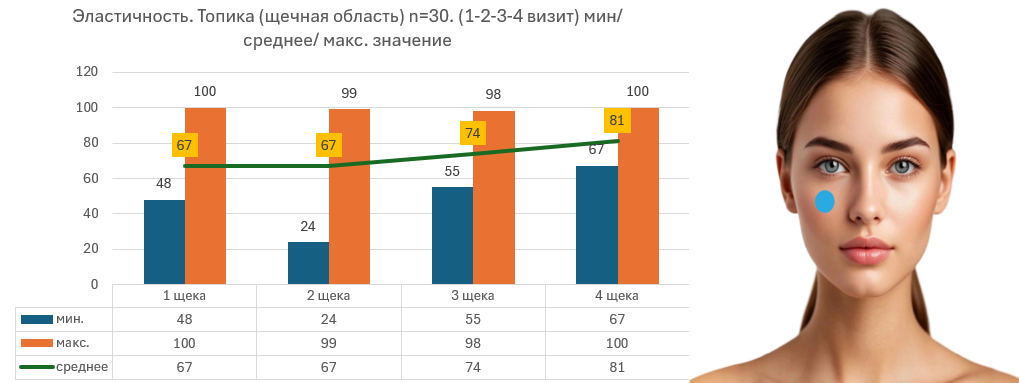 1.Область щеки: средние показатели эластичности: 1 визит/4 визит составляют 67ЕД/67ЕД, увеличение на + 20 %