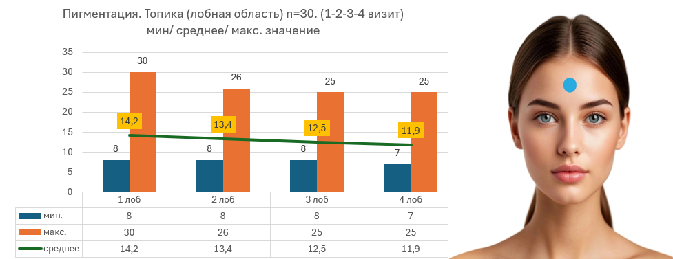 2.Область лба: средние показатели 1 визит/4 визит составляют 14,2ЕД/11,9 ЕД, что составляет прирост -17% (снижение пигментации).