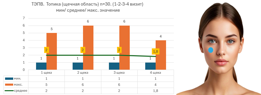 1.Область щеки: средние показатели 1 визит/4 визит составляют 2ЕД/1,8 ЕД, что составляет - 10% (снижение ТЭПВ).