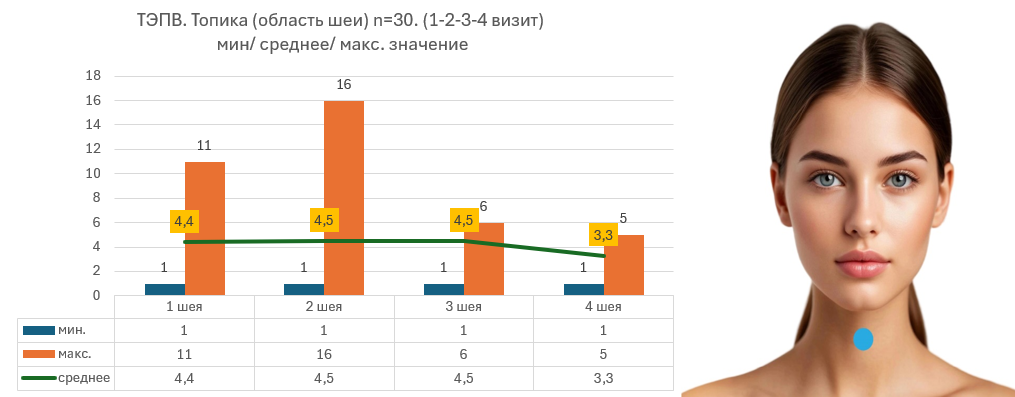 3.Область шеи: средние показатели 1 визит/4 визит составляют 4,4ЕД/3,4ЕД, что составляет -25% (снижение ТЭПВ).