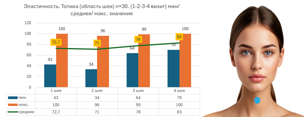3.Область шеи: средние показатели эластичности: 1 визит/4 визит составляют 72,7 ЕД/83 ЕД, увеличение на +14 %