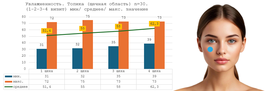 1.Область щеки: средние показатели 1 визит/4 визит составляют 32,5 ЕД/19,3 ЕД, прирост +41% (увеличение увлажненности кожи).