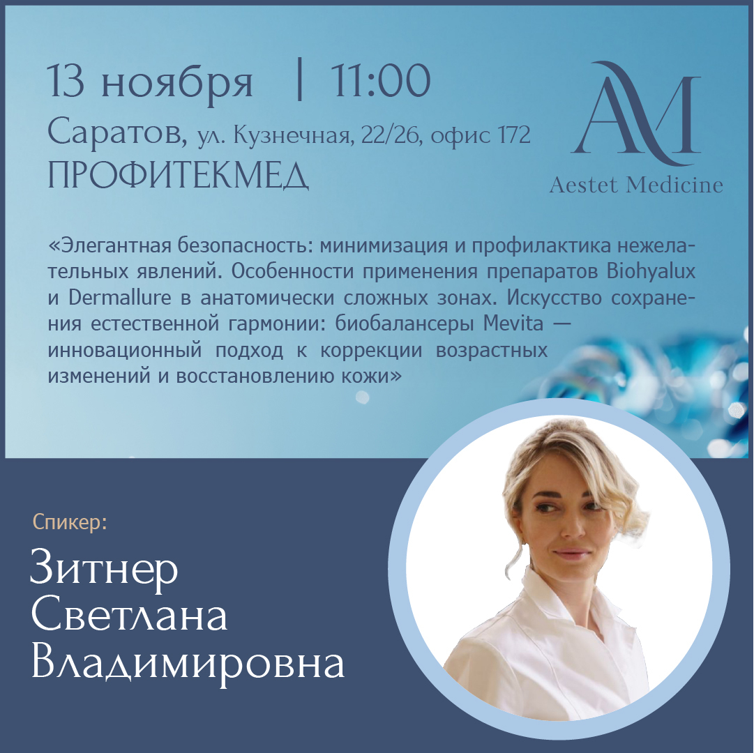 Тема: Элегантная безопасность: минимизация и профилактика нежелательных явлений. Особенности применения препаратов Biohyalux и Dermallure в анатомически сложных зонах. Искусство сохранения естественной гармонии: биобалансеры Mevita — инновационный подход к коррекции возрастных изменений и восстановлению кожи.